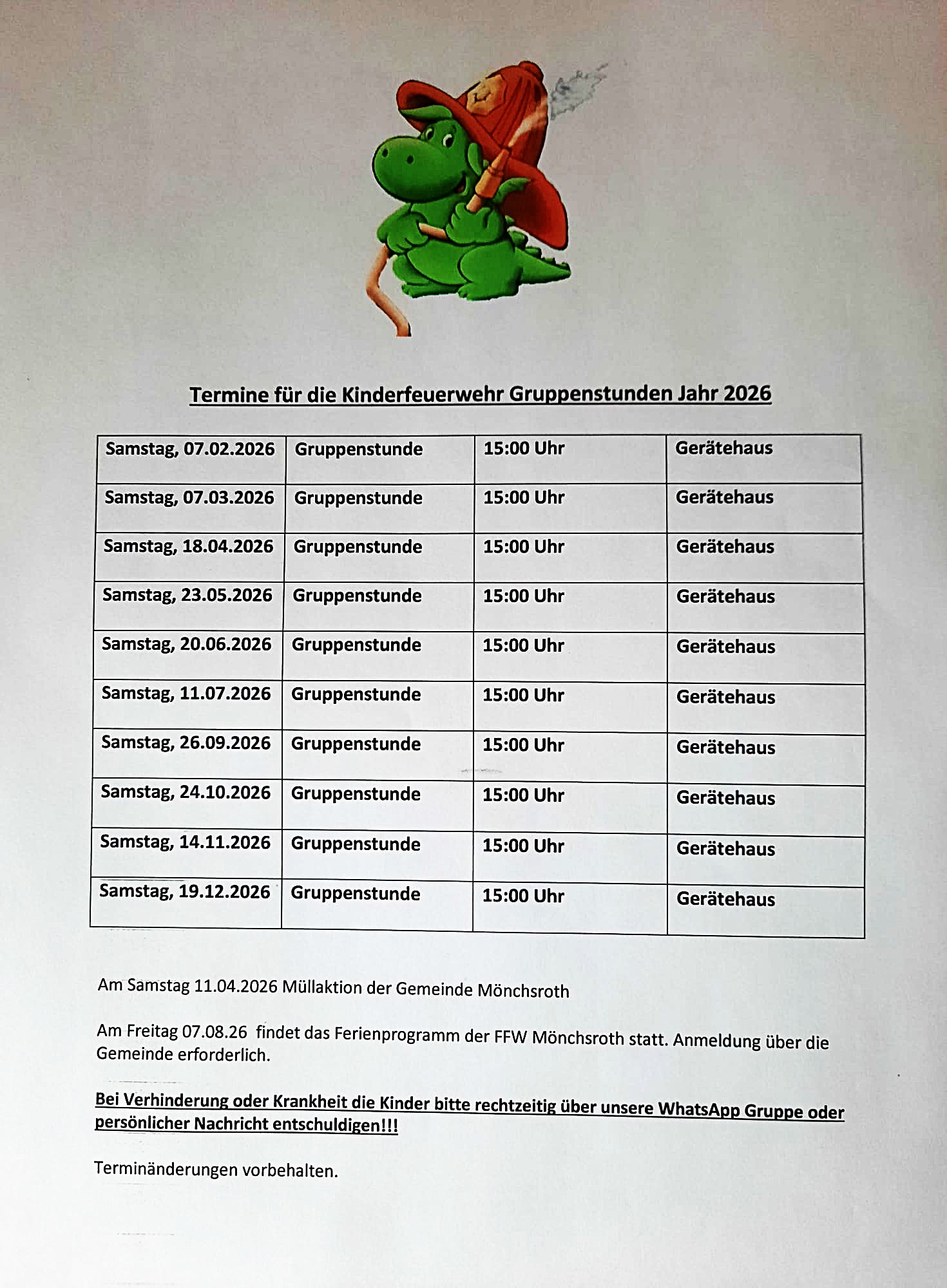 Übungspläne Aktive Wehr , Jugendfeuerwehr und Kinderfeuerwehr, Ausfahrplan für Probefahrten 2026